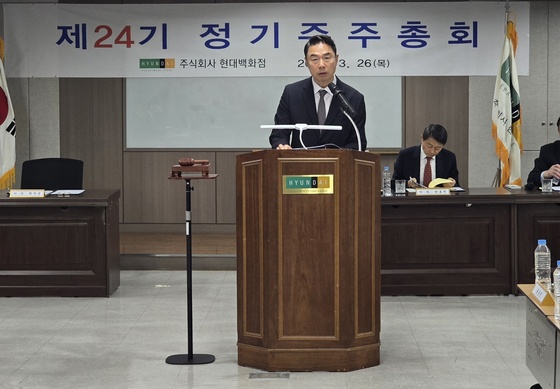 정지영 현대백화점 대표는 26일 서울 강동구 우진빌딩에서 열린 제24기 정기 주주총회에서 인사말을 하고 있다. 현대백화점 제공.정지영 현대백화점…