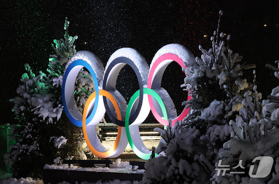 2026 밀라노·코르티나담페초 동계올림픽 개막을 이틀 앞둔 4일현지시간 이탈리아 코르티나담페초 광장에 설치된 올림픽 오륜기 조형물 뒤로 눈이 내리고 있…