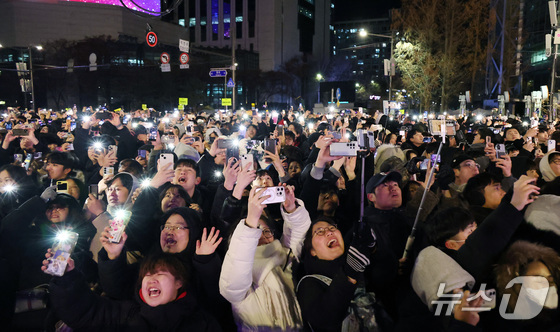 31일 오후 서울 종로구 보신각에서 열린 2025 제야의 종 타종행사에서 시민들이 새해를 앞두고 카운트다운을 하고 있다. 공동취재 2026.1.1/뉴스…