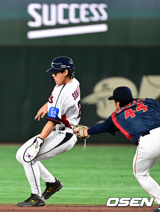 [OSEN=이상학 기자] 일본야구대표팀 좌완 카네마루 유메토(22·주니치 드래건스)가 한국 타선에 3이닝 3실점으로 고전했다. 한국 송성문과 안현민은 절묘한 더블 스틸을 합작하며