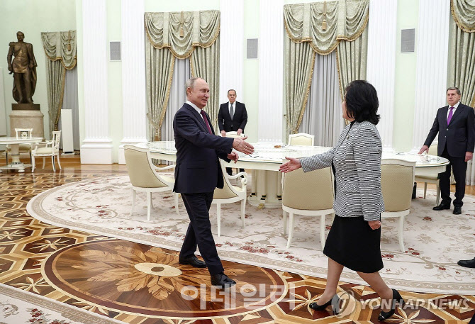 푸틴 대통령과 최선희 북한 외무상. (사진=타스 연합뉴스) [이데일리 마켓in 송재민 기자]블라디미르 푸틴 러시아 대통령이 27일(현지 시각) 모스크바 크렘린궁에서 최선희 북한 외