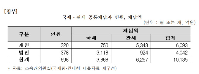 [이데일리 조용석 기자] 소득세·법인세 등 국세와 해외서 물품 수입 시 납부해야 할 관세를 동시에 체납한 이들이 700명에 달하며 체납액 규모도 1조원을 넘어선 것으로 집계됐다.