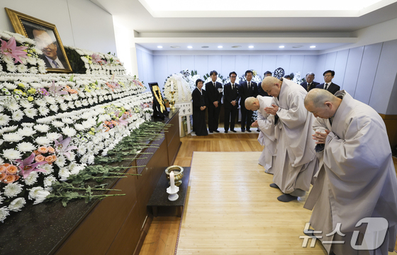 천태종 감사원장인 용구스님오른쪽 두 번째이 29일 서울 종로구 서울대학교병원 장례식장에 마련된 고 이해찬 전 국무총리의 빈소에서 조문을 하고 있다. 2…