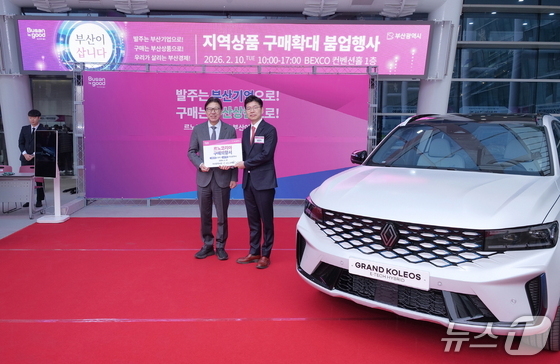 지난 10일 부산 벡스코에서 부산시 주최로 열린 지역상품 우선구매 붐업행사에서 박형준 부산시장좌측과 김광국 르노코리아 영업본부 남동부지역본부장이 기념 …