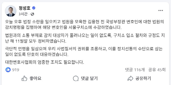 [이데일리 나은경 기자] 정성호 법무부 장관이 3일 김용현 전 국방부 장관 변호인 이하상 변호사에 대해 “극단적 언행을 일삼으며 우리 사법질서의 권위를 조롱하고, 이를 정치선동의