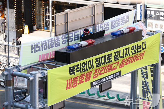 세종호텔에서 해고된 고진수 관광레저산업노조 세종호텔 지부장이 지난해 2월 13일 서울 중구 세종호텔 앞 지하차도진입차단시설에 올라 복직을 요구하며 농성을 하고 있다.20…