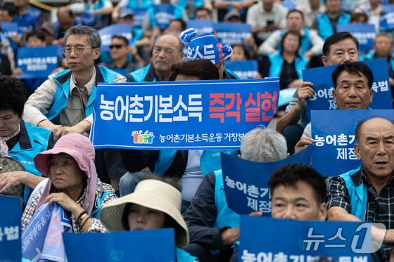 12일 서울 여의도 국회에서 열린 '농어촌기본소득 입법 촉구 500인 기자회견'에서 참가자들이 농어촌 기본소득법 제정을 촉구하고 있다. 농어촌기본소득 법안은 농어촌 읍·…