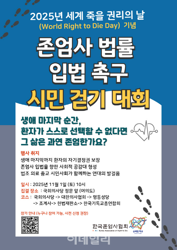 [이데일리 성주원 기자] 한국존엄사협회와 순레길학교는 오는 11월 1일 서울 여의도 국회에서 헌법재판소까지 약 7.5km를 걷는 ‘존엄사 법률 입법촉구 걷기대회’를 개최한다고 24