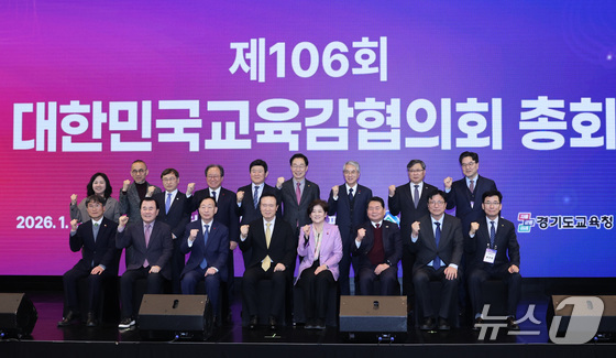 정근식 서울시교육감 등 전국교육감들이 지난 29일 오후 경기도 성남시 더블트리바이힐튼호텔에서 열린 제106회 대한민국시도교육감협의회 총회에서 기념촬영을 하고 있다. …