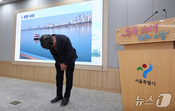 김선직 한강버스 대표가 17일 서울 중구 서울시청 브리핑룸에서 열린 한강버스 멈춤사고 관련 브리핑에 앞서 사과하고 있다. 2025.11.17/뉴스1 News…