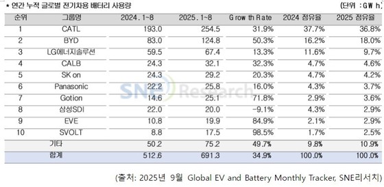 1~8월 전기차 배터리 시장 34.9% 성장…韓 3사 점유율 3.8%p↓