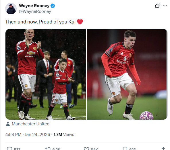 맨유 레전드의 아들, 유스 복귀전서 맹활약 "부전자전이네"... '루니 주니어' 카이, 맨유 레전드한테 눈도장