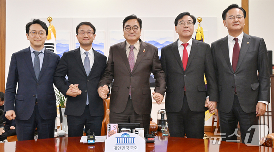 우원식 국회의장가운데과 한병도 더불어민주당 원내대표, 송언석 국민의힘 원내대표 등이 14일 서울 여의도 국회 의장실에서 여야 원내대표 회동을 하고 있다…