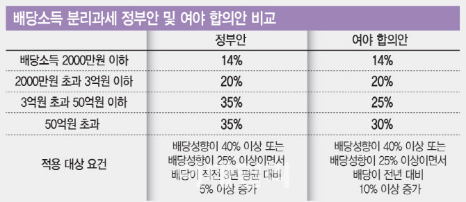 [이데일리 원다연 기자] 내년 배당부터 배당소득 분리과세가 적용된다. 당초 정부안보다 세율을 인하하면서, 30%의 최고세율을 적용하는 배당소득 50억원 초과 구간을 신설해 증시 활