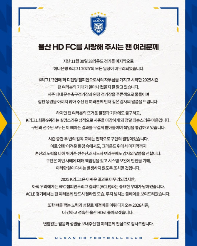 [이데일리 스타in 이석무 기자] 2025시즌 충격적인 부진에 허덕이며 9위로 시즌을 마감한 울산HD가 팬들에게 고개 숙였다. 울산 HD는 2일 구단 공식 SNS를 통해 ‘울산 H