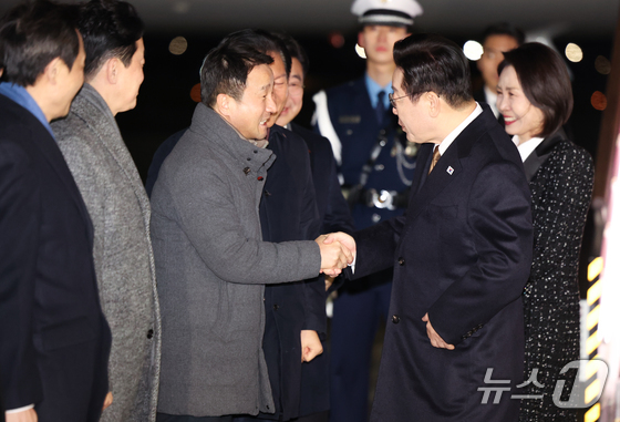 일본 순방 일정을 마친 이재명 대통령이 14일 경기 성남 서울공항에 도착해 한병도 더불어민주당 신임 원내대표와 인사하고 있다. 2026.1.14/뉴스1 Ne…