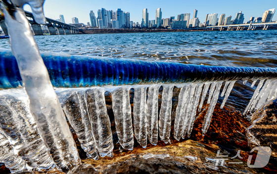 영하권 추위로 본격적인 겨울날씨를 보인 31일 서울 영등포구 여의도 인근 한강에 고드름이 얼어있다. 2025.12.31/뉴스1 News1 이호윤 기자…