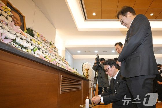 우원식 국회의장, 김민석 국무총리, 정청래 더불어민주당 대표가 27일 오전 서울 종로구 서울대학교병원 장례식장에 마련된 故 이해찬 전 국무총리의 빈소에서 조문하고 있다.…