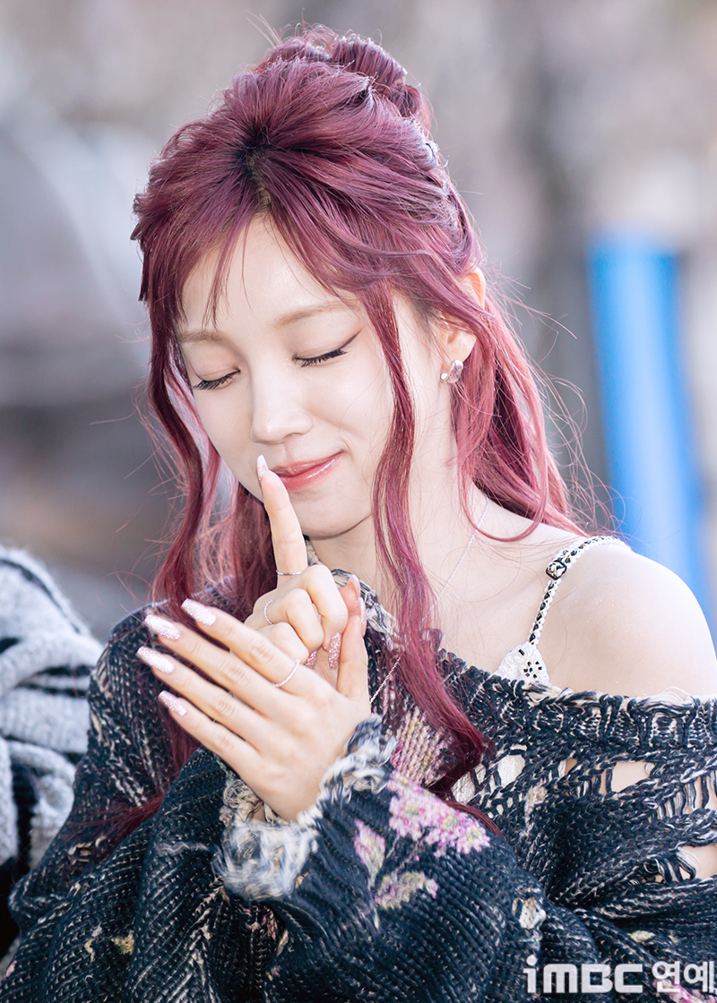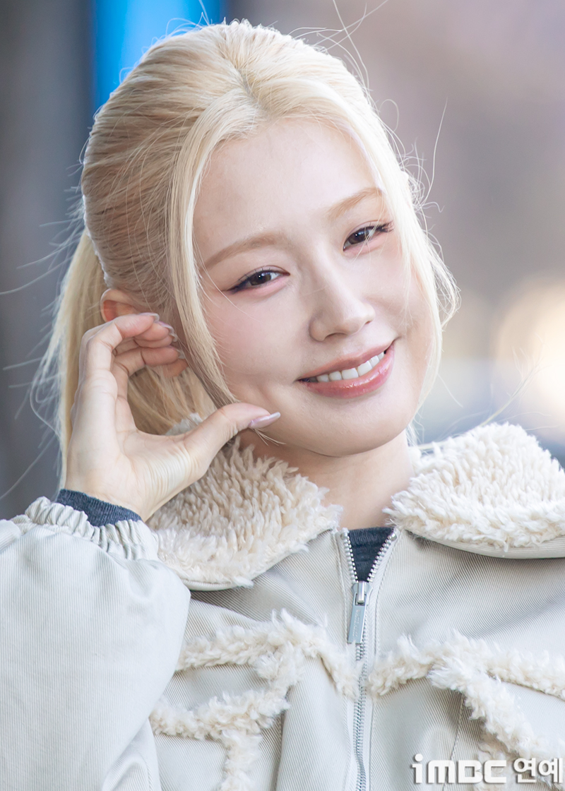 아이들(i-dle) 미연이 28일 오후 서울 상암MBC 신사옥에서 열린 MBC FM4U ‘정오의 희망곡 김신영입니다’ 라디오 출근길에 포즈를 취하고 있다. 아이들(미연 민니 소연