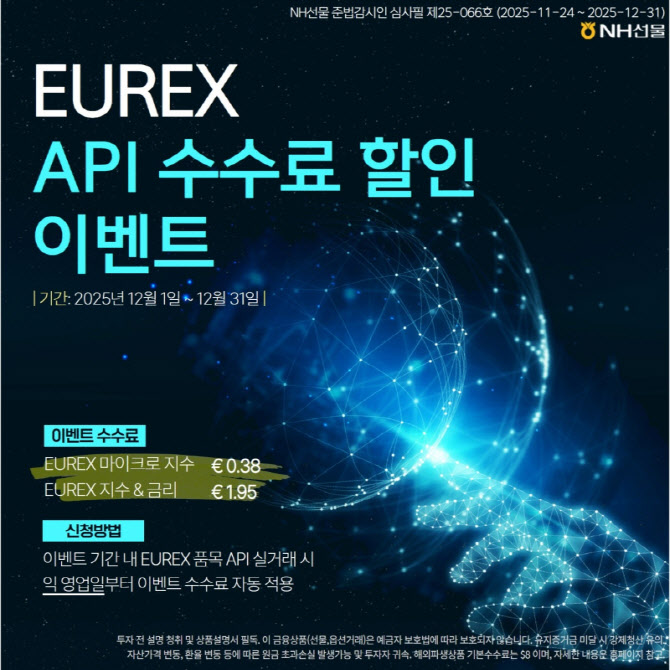 [이데일리 박순엽 기자] NH선물은 12월 한 달간 EUREX 품목 API 거래 고객들을 대상으로 수수료 할인 이벤트를 진행한다고 24일 밝혔다. (사진=NH선물) 최근 글로벌 경