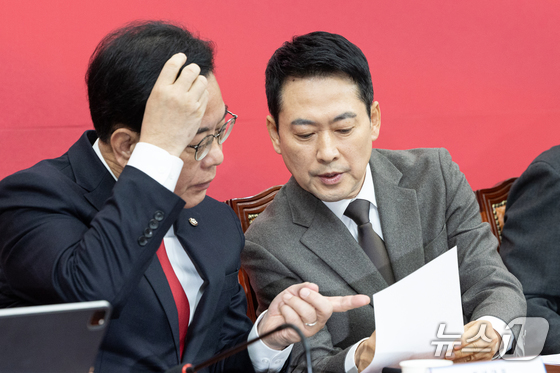 장동혁 국민의힘 대표가 29일 서울 여의도 국회에서 열린 최고위원회의에서 송언석 원내대표와 대화하고 있다. 2026.1.29/뉴스1 News1 이승배 기자…