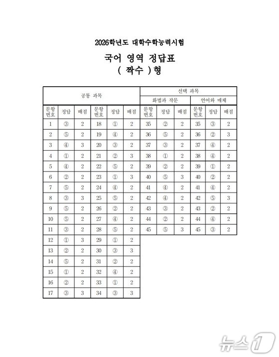 2026학년도 대학수학능력시험 1교시 국어영역 정답표짝수형/한국교육과정평가원 제공ⓒ 뉴스1kjh7@news1.kr