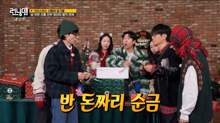 김종국이 송지효를 위해 금 반 돈을 준비했다. 21일 방송된 SBS '런닝맨'은 '크리스마스 선물에 닿기를' 레이스가 펼쳐졌다. 이날 멤버들은 금 반 돈 열쇠, 술잔 세트, 호피