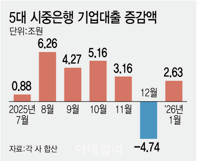 [이데일리 김국배 기자] 주요 시중은행에서 새해 첫 달 기업대출이 2조원대 늘어나는 데 그쳤다. 이재명 정부의 ‘생산적 금융’ 확대 기조 아래 지난해 하반기 기업대출이 증가세를 보