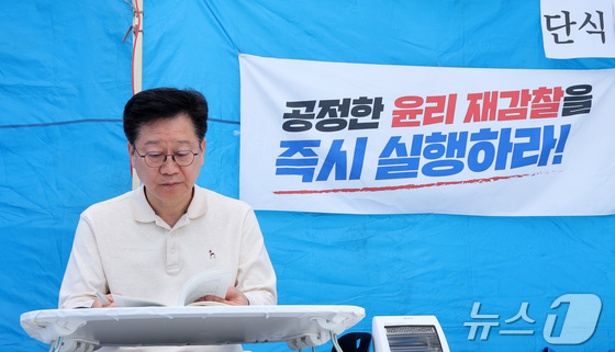 전북지사 경선에서 낙마한 안호영 더불어민주당 의원이 12일 서울 여의도 국회 본청 앞에서 이원택 전북지사 후보의 '주류·식사비 대납' 의혹에 대한 재감찰을 요구하며 단식…