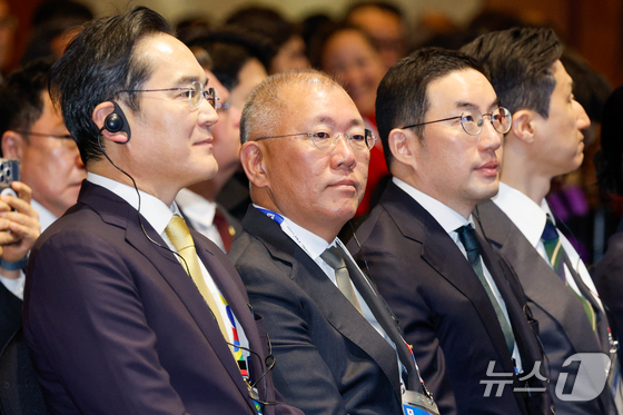 이재용 삼성전자 회장왼쪽부터, 정의선 현대차그룹 회장, 구광모 LG그룹 회장, 정기선 HD현대 회장이 23일 오후 서울 중구 롯데호텔에서 열린 한-브라…