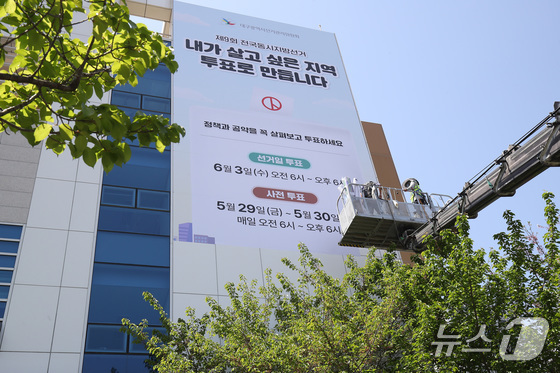 15일 대구 서구 대구시선거관리위원회 청사 외벽에 오는 6월 3일 실시되는 제9회 전국동시지방선거를 알리는 래핑 작업이 진행되고 있다. 2026.4.15 뉴…