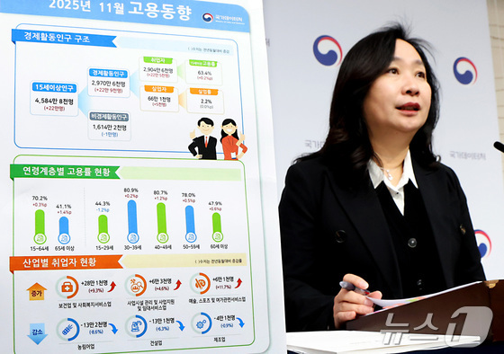 공미숙 국가데이터처 사회통계국장이 10일 세종시 정부세종청사에서 2025년 11월 고용동향 결과를 발표하고 있다.. 2025.12.10/뉴스1 News1 김…