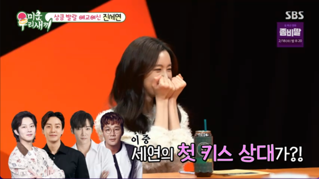 진세연이 최진혁이 첫 키스 상대라고 밝혔다. 15일 방송된 SBS '미운 우리 새끼'에는 배우 진세연이 스페셜 MC로 출연했다. 이날 진세연은 '미우새' 아들들 중 첫 키스 상대가