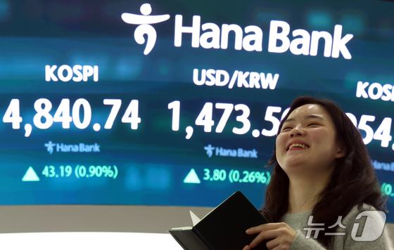 코스피 종가가 사상최고치를 기록한 16일 오후 서울 중구 하나은행 본점 딜링룸 전광판에 증시 종가 시황이 나타나고 있다. 이날 코스피 지수는 전거래일 대비 43.19…