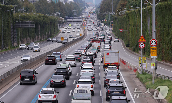 추석 연휴 첫날인 일 오후 서울 서초구 잠원IC 부근 경부고속도로 하행선이 귀성 차량으로 정체를 빚고 있다. ../뉴스 News 박지혜 기…