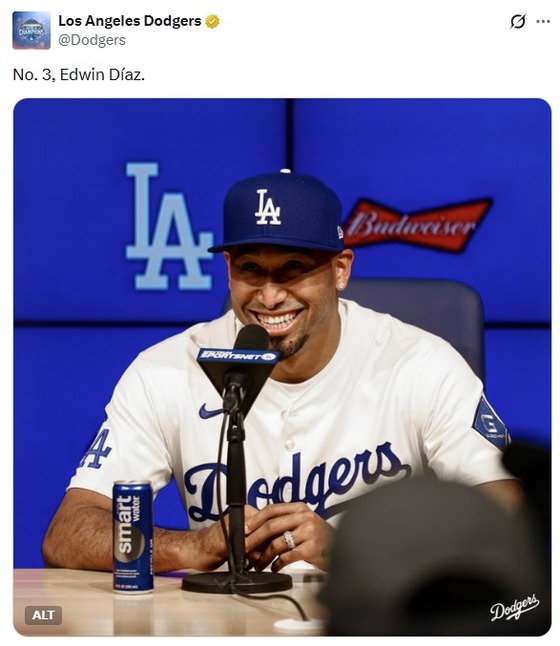 LA 다저스 유니폼을 입은 에드윈 디아즈. LA 다저스 SNS 캡처메이저리그MLB LA 다저스에 입단한 마무리 투수 에드윈 디…