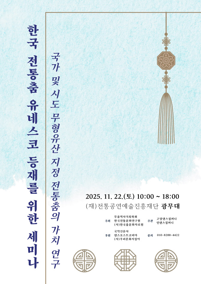 [이데일리 김지완 기자] 우리 전통춤의 유네스코(UNESCO) 등재를 위한 대규모 학술 세미나가 열려 주목된다. 한국전통문화연구원에 따르면 오는 22일 전통진흥예술진흥재단 광무대에