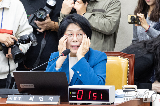 지난 일 서울 여의도 국회에서 열린 과학기술정보방송통신위원회 한국방송공사 등에 대한 국정감사에서 최민희 위원장이 김장겸 국민의힘 의원의 질의를 듣고 있다. …
