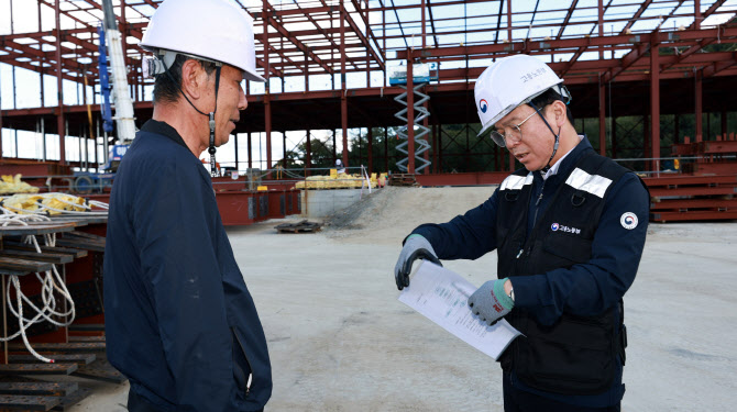 [세종=이데일리 서대웅 기자] 정부가 11월 한 달간 공공기관 발주 건설현장에 대한 안전보건 집중점검기간을 운영한다고 4일 밝혔다. 김영훈(왼쪽) 고용노동부 장관이 지난달 24일