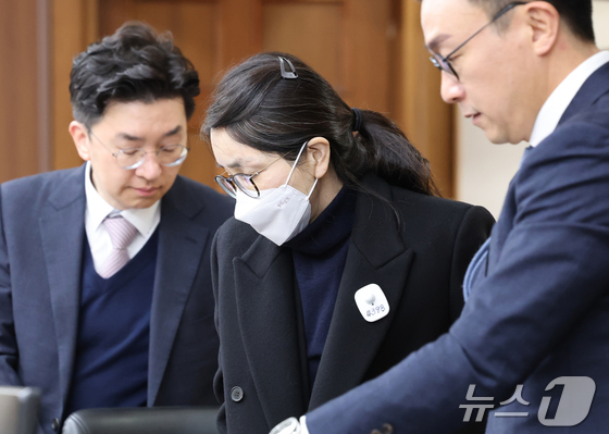 3일 서울 서초구 서울중앙지방법원에서 주가조작과 통일교 청탁 등의 혐의를 받는 김건희 씨의 결심공판 진행된 가운데 김건희 씨가 피고인 자리로 들어서고 있다. 2025.1…