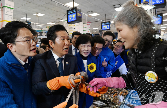 정청래 더불어민주당 대표가 정원오, 박주민, 전현희 서울시장 예비후보 등과 30일 서울 동작구 노량진수산시장을 찾아 수산물을 살펴보고 있다. 공동취재 …