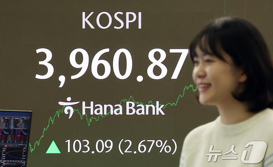 26일 오후 서울 중구 하나은행 딜링룸 전광판에 코스피 지수가 전 거래일 대비 103.09포인트2.67% 오른 3960.87을 나타내고 있다. 2025…