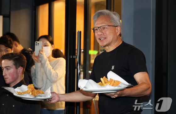 젠슬황 엔비디아 최고경영자가 일 서울 강남구 깐부치킨 삼성점에서 이재용 삼성전자 회장과 정의선 현대차그룹 회장과 '치맥' 회동 중 시민들에게 치킨을 나눠주고 있다. …