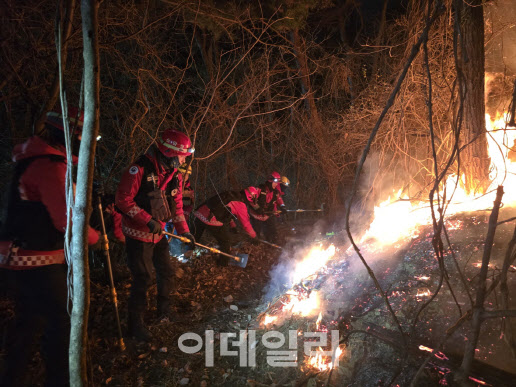 [이데일리 박진환 기자] 21일부터 이틀째 이어진 부산 기장과 전남 광양 산불에 대한 주불 진화가 완료됐다. 21일 발생한 부산 기장 산불을 산림청 산불특수진화대원들이 진화하고 있