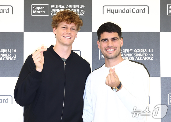 카를로스 알카라스와 얀니크 신네르가 9일 오후 서울 영등포구 현대카드 본사에서 열린 '현대카드 슈퍼매치 14' 기자회견에서 기념촬영을 하고 있다. 세계 남자 테니스계를 …