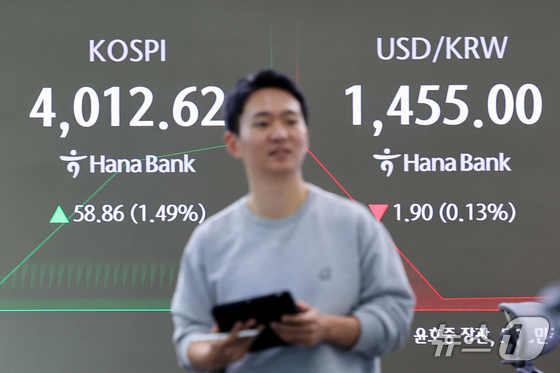10일 오전 서울 중구 하나은행 본점 딜링룸 전광판에 코스피, 코스닥 지수와 달러·원 환율이 나오고 있다. 이날 코스피는 38.11포인트0.96% 오른…