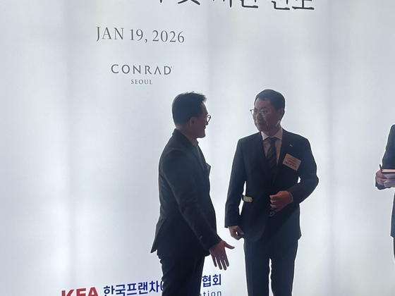 오른쪽나명석한국프랜차이즈산업협회장이 19일서울 여의도 콘래드호텔 그랜드볼룸 열린 '제8대·제9대 협회장 이취임식 및 비전 선포식'에서 이야기를 나누는 …