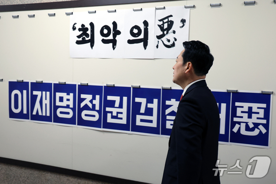 장동혁 국민의힘 대표가 지난 25일 오전 서울 여의도 국회 당대표실에서 원내대표실로 발걸음을 옮기고 있다. 2026.3.25 뉴스1 황기선 기자장동혁…