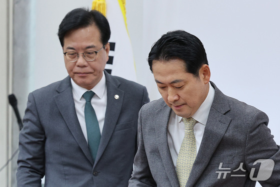 장동혁 국민의힘 대표와 송언석 원내대표가 지난 6일 서울 여의도 국회에서 열린 최고위원회의에 참석하고 있다. 2025.11.6/뉴스1 News1 신웅수 기자…