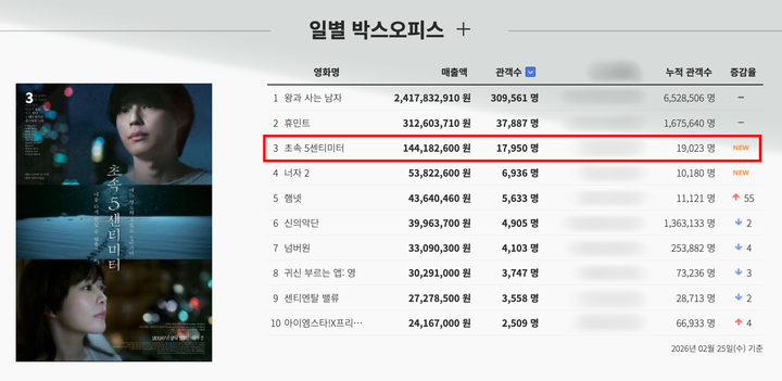(MHN 민서영 기자) 영화 '초속 5센티미터'가 개봉과 동시에 예술영화 박스오피스 1위를 차지했다. 지난 25일 개봉한 영화 '초속 5센티미터'는 개봉 전부터 동시기 개봉작 예매